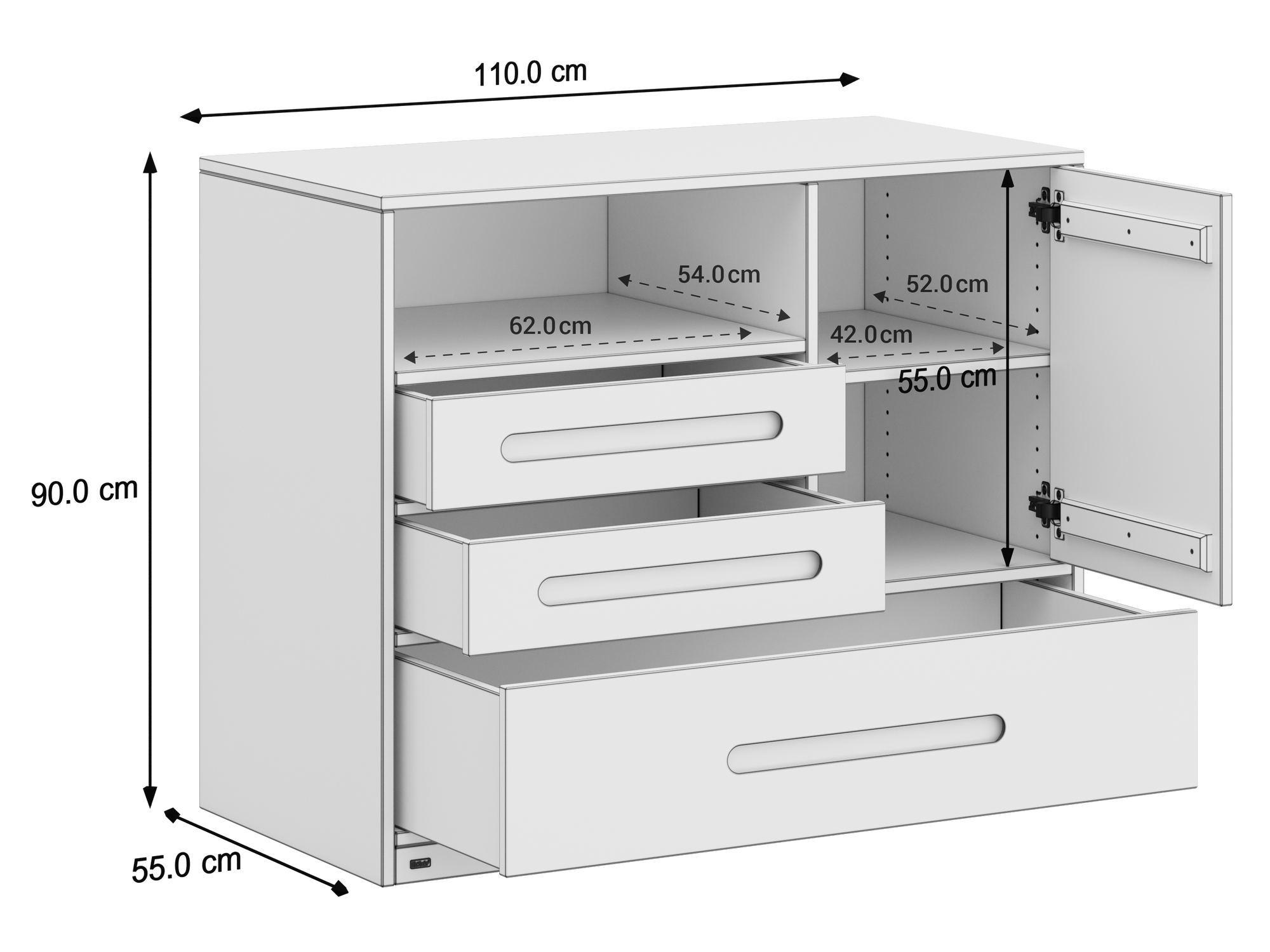 - Schrankfach, drei Schubladen und offenes Regalfach für flexible Aufbewahrung