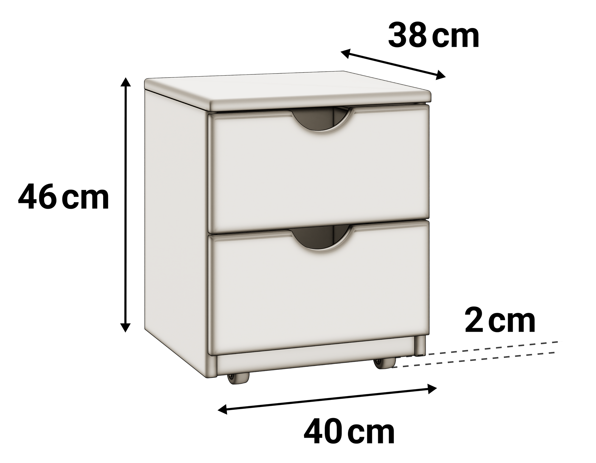 - Außenmaß: H 46 cm (H 48 cm mit Rollen) x B 40 cm x T 38 cm